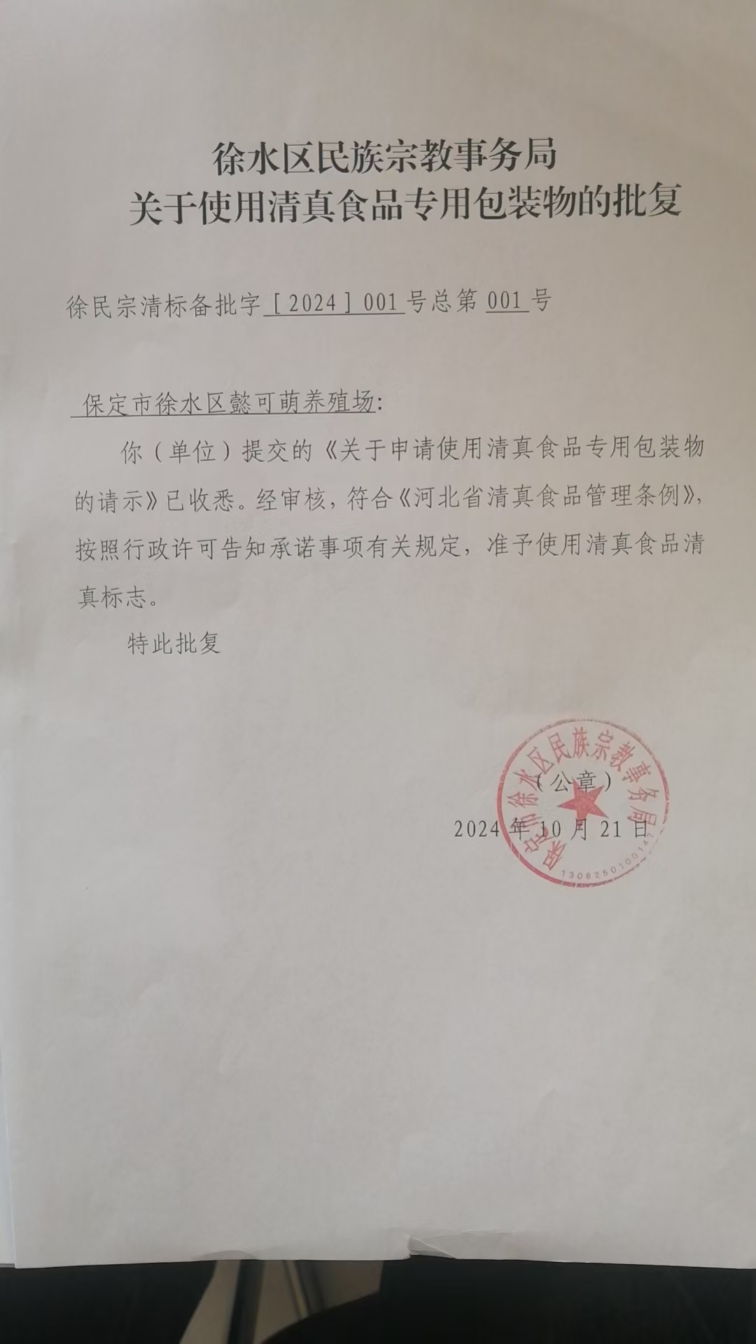 关于清真食品专用包装物的许可-保定市徐水区懿可萌养殖场