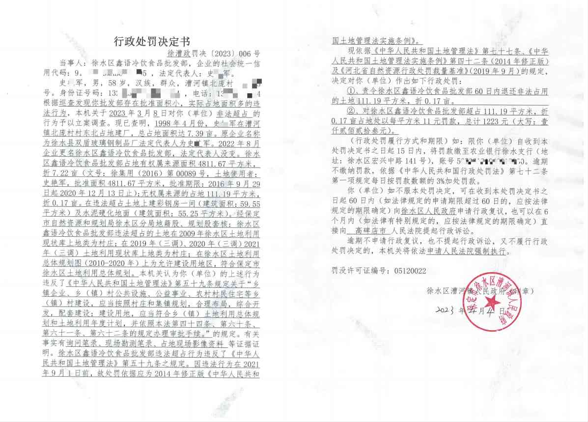 徐水区鑫语冷饮食品批发部超出批准面积占地建房案