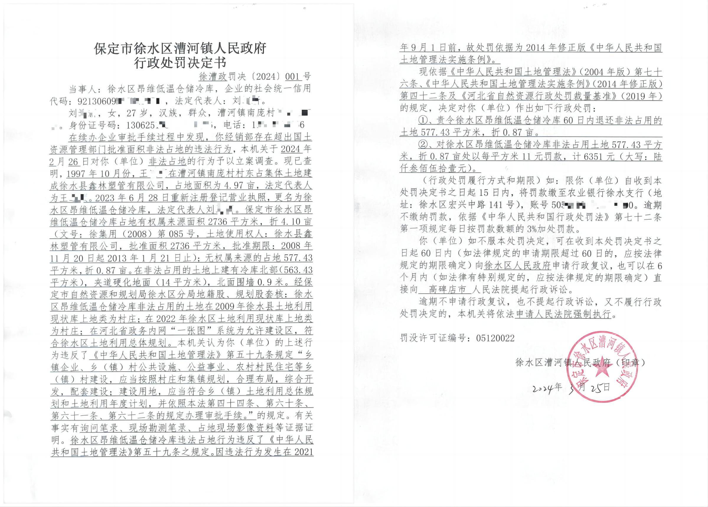 行政处罚决定书徐漕政罚决〔2024〕001号