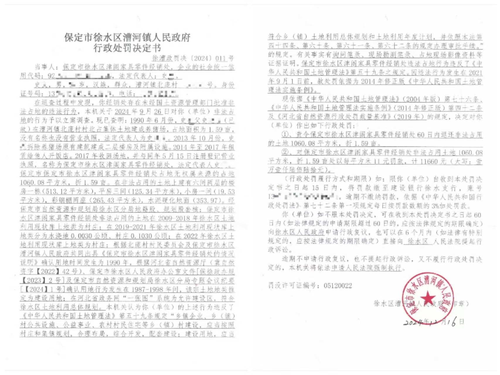 行政处罚决定书徐漕政罚决〔2024〕011号