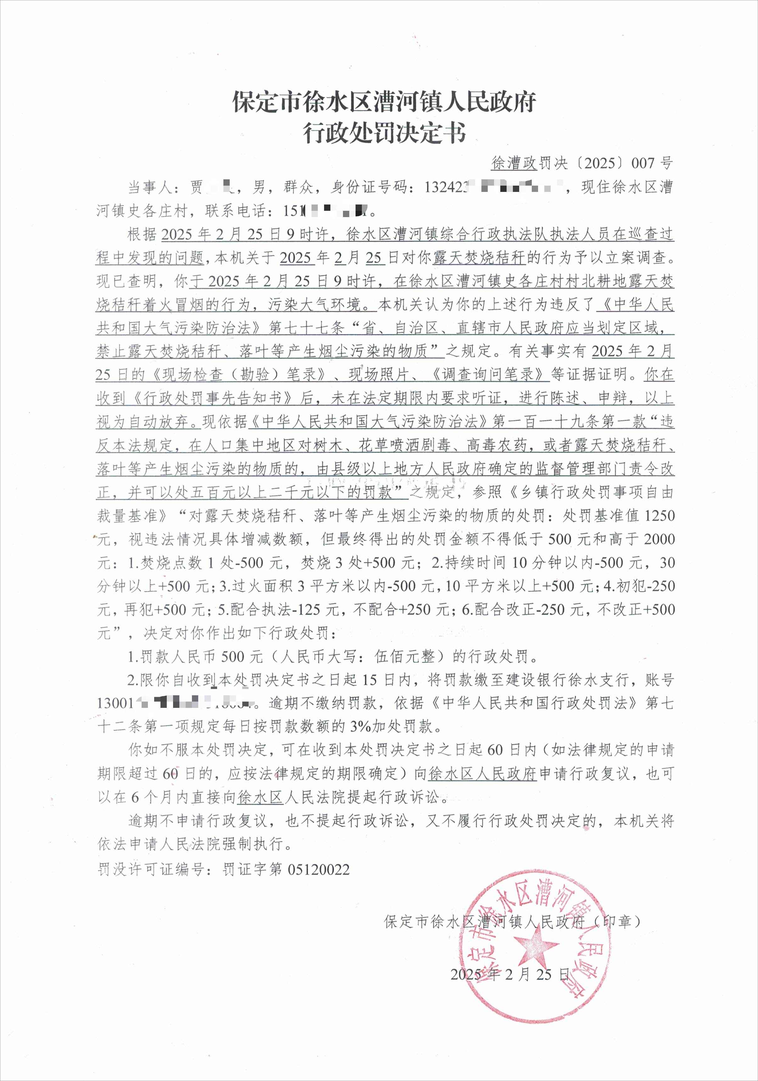 行政处罚决定书徐漕政罚决〔2025〕007号