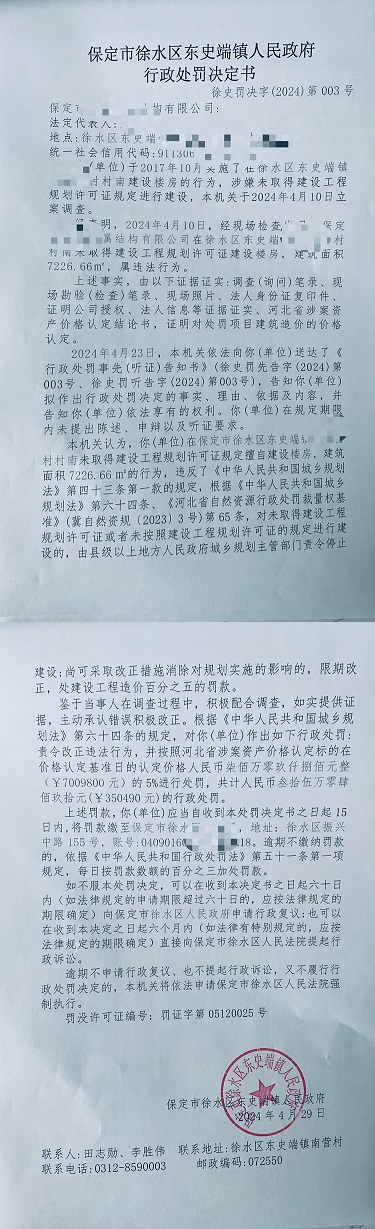 徐水区东史端镇德赢VWIN行政处罚决定书【2024】003