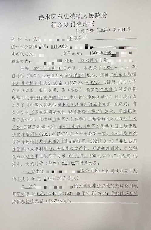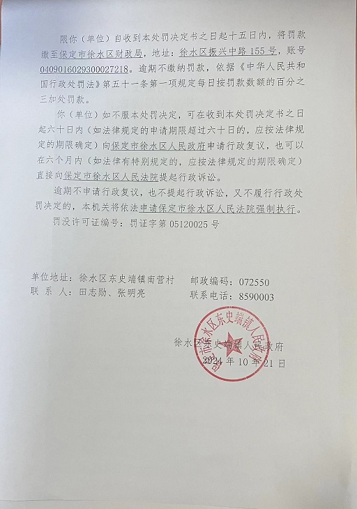 徐水区东史端镇德赢VWIN行政处罚决定书【2024】004号