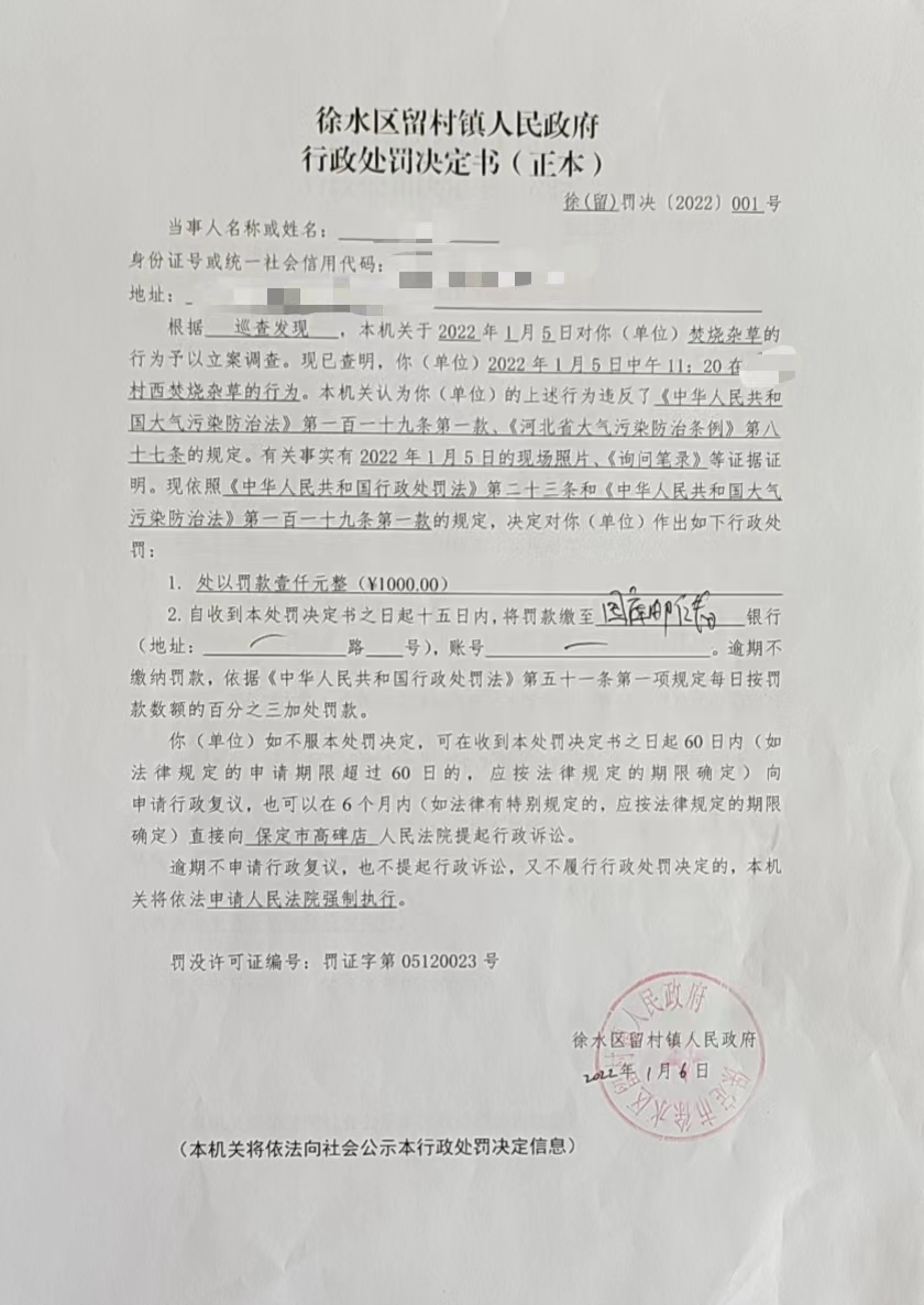 行政处罚决定书徐(留)罚决〔2022〕001号